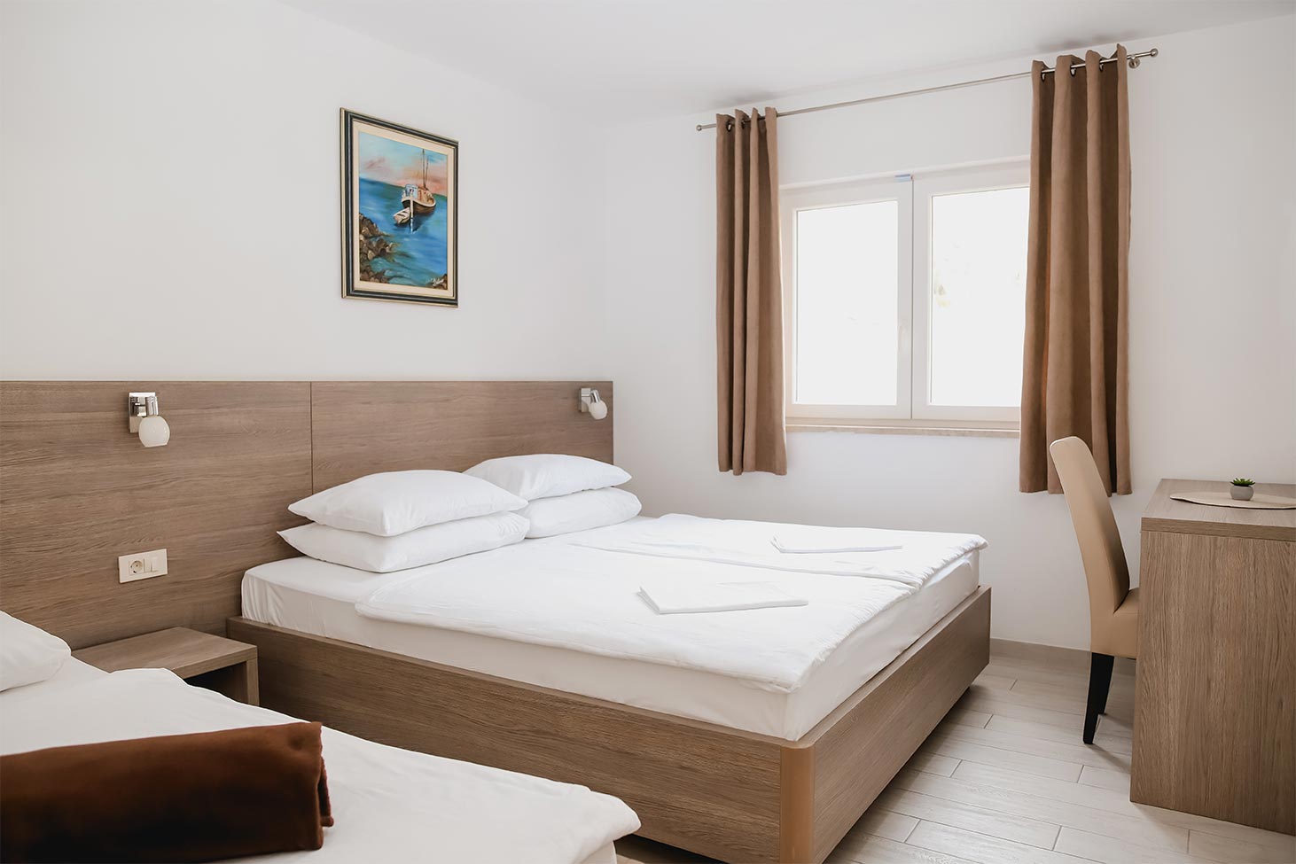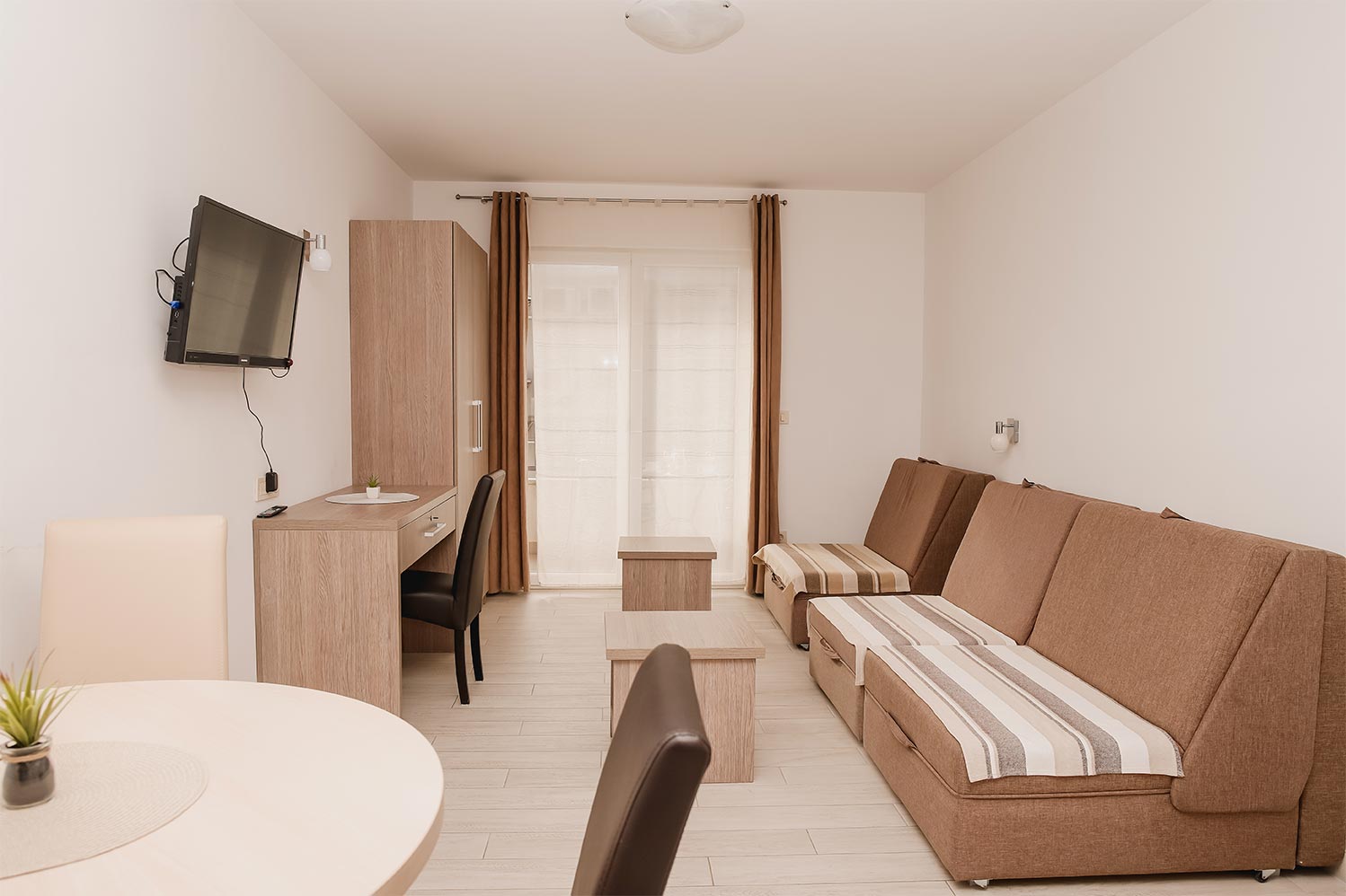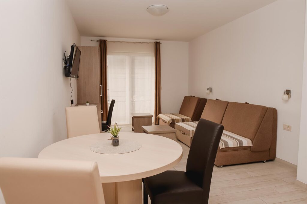 The 60 m² apartment is an ideal choice for a couple with children or a small group of friends who want to spend their vacation in comfortable accommodation, close to the beach and all necessary amenities. The apartment consists of one bedroom with a large double bed and an additional single bed, a living room with 3 sofa beds, a kitchen, a bathroom and a balcony.